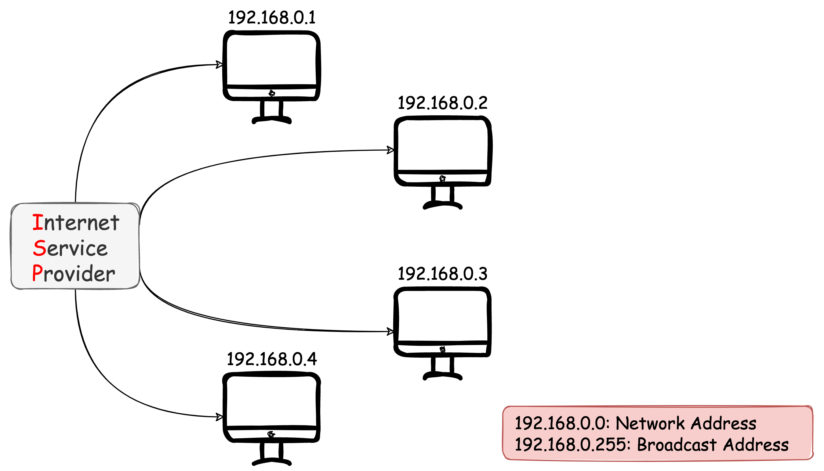 IP 주소는 MAC 주소와 달리 호스트부를 변경해 가면서 할당된다. 이때 아래의 규칙을 따른다.