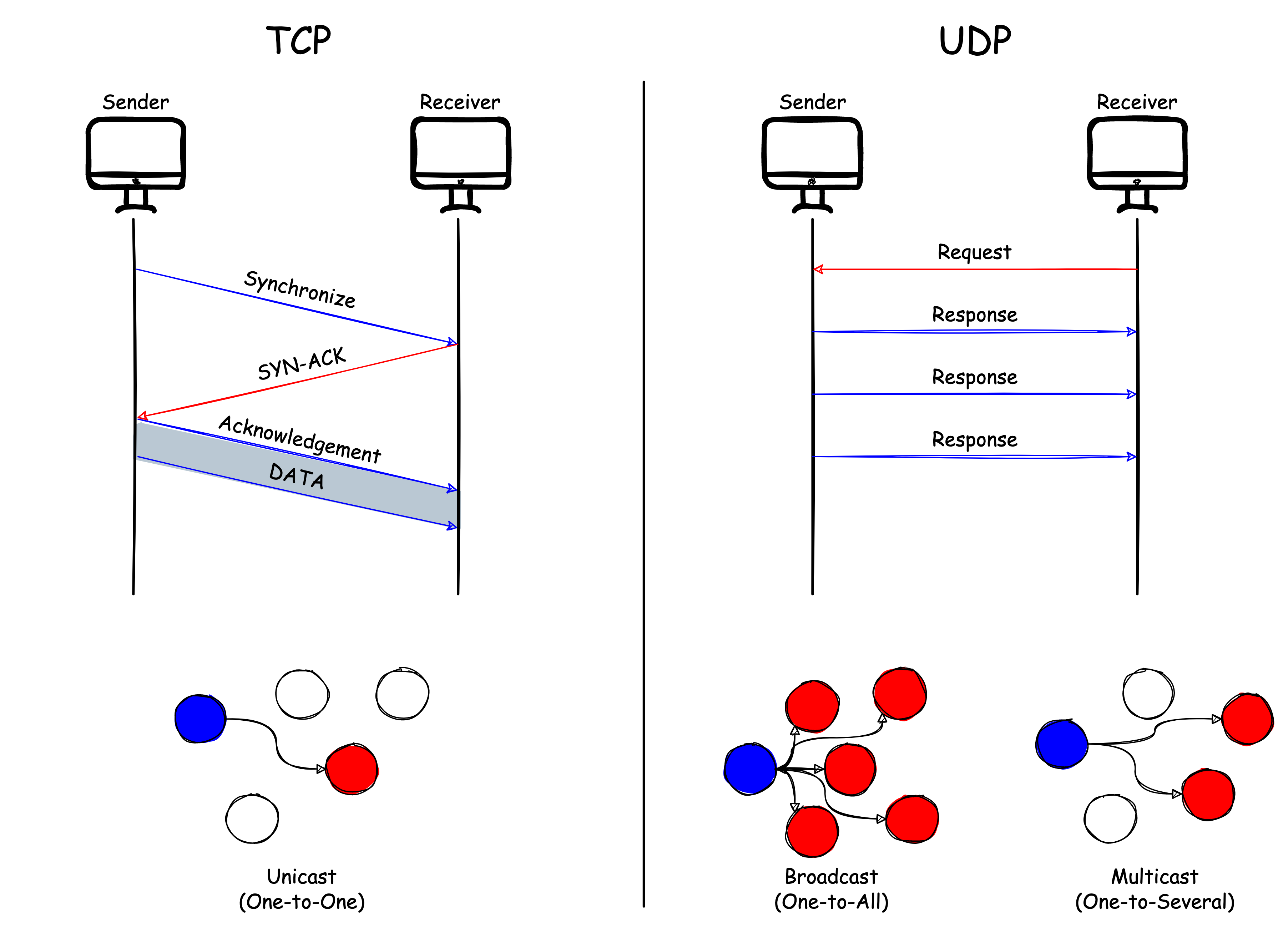 위 그림에서 왼쪽이 TCP, 오른쪽이 UDP를 대략적으로 나타낸다.