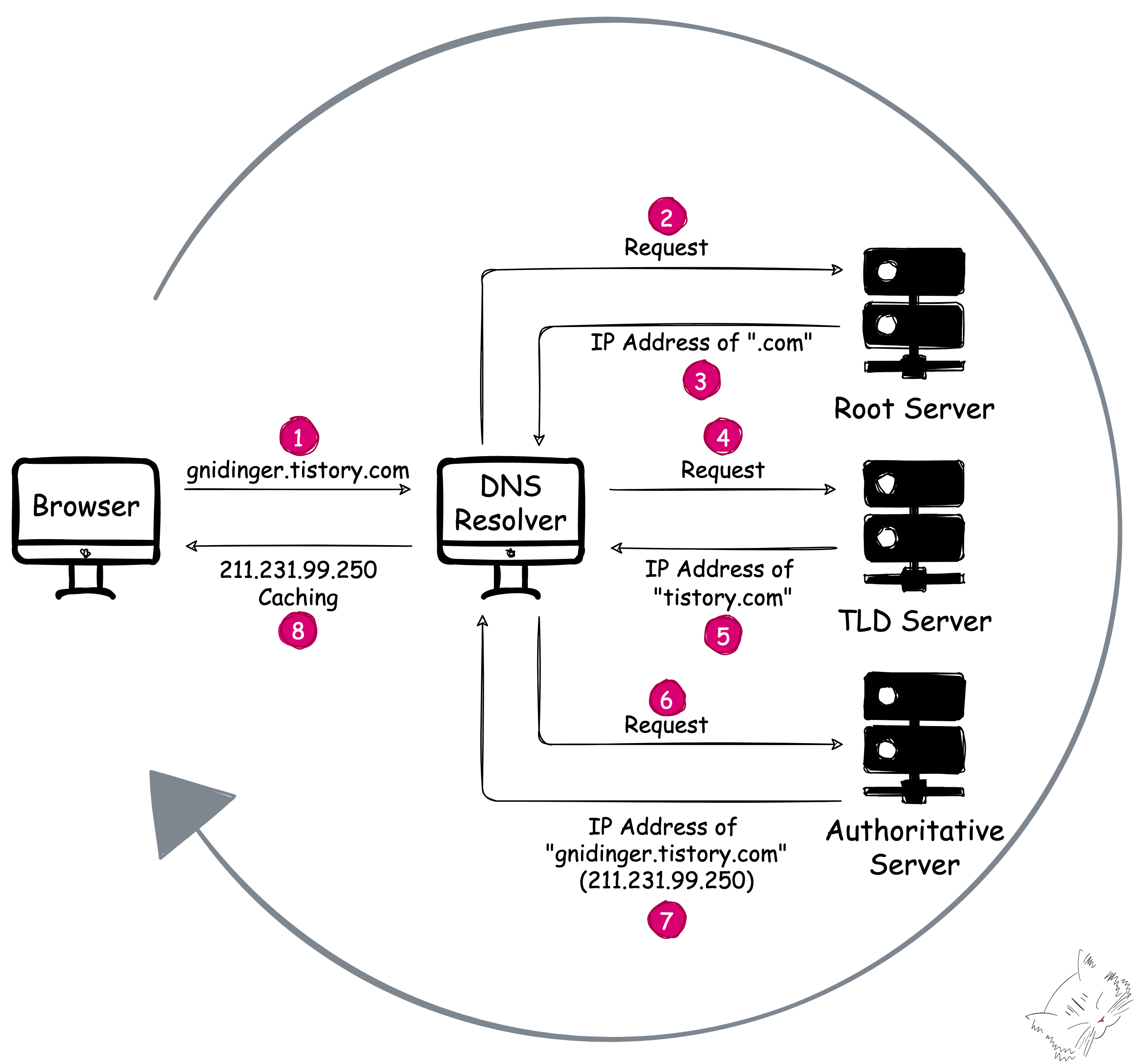 다시 DNS Lookup으로 돌아오면, 그 과정은 다음과 같이 진행된다.