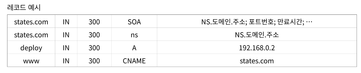 - 이름 - 'example.com'과 같은 도메인 네임 혹은 서브 도메인의 이름을 저장