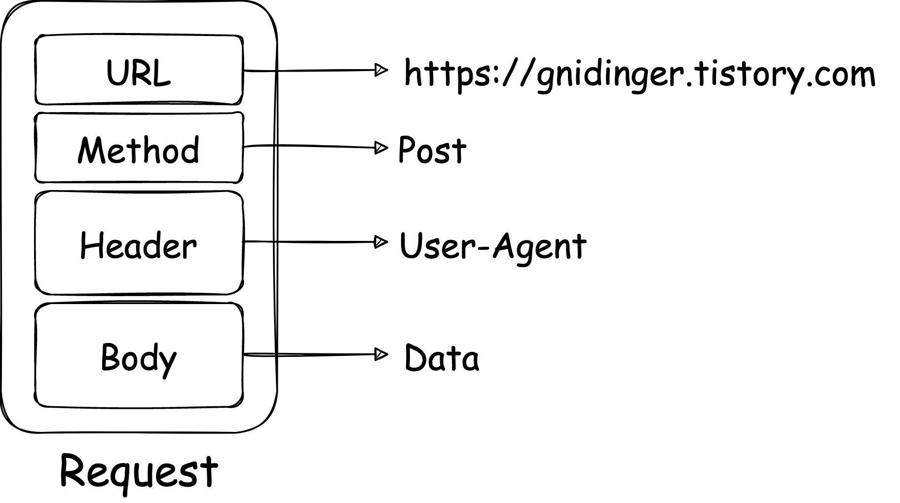 요청은 클라이언트가 서버에 보내는 메시지이다. 위 그림에서 볼 수 있듯이 크게 세 부분으로 나뉜다.
