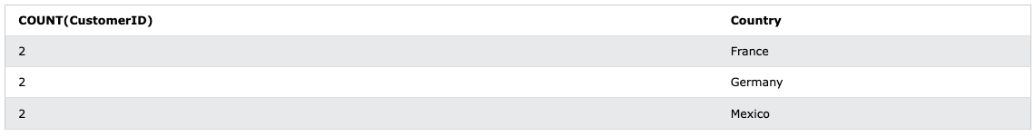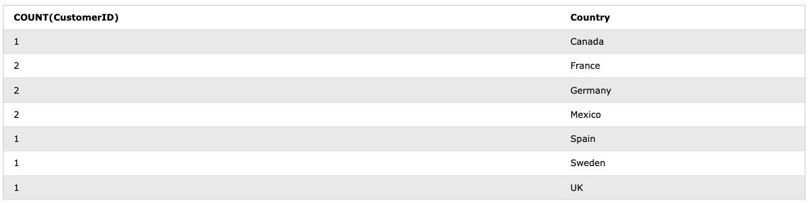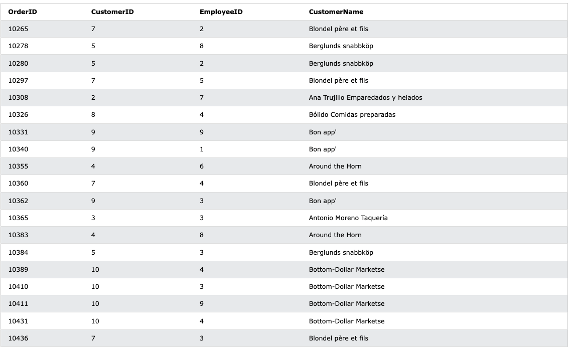 CustomerID - 1과 6의 경우엔 Orders 테이블에 존재하지 않아 제외된 것도 볼 수 있다.