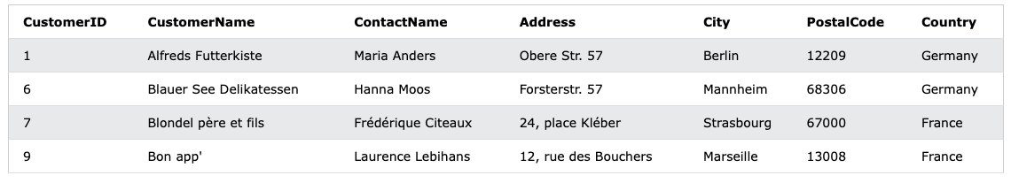 WHERE Country IN ('Germany', 'France');