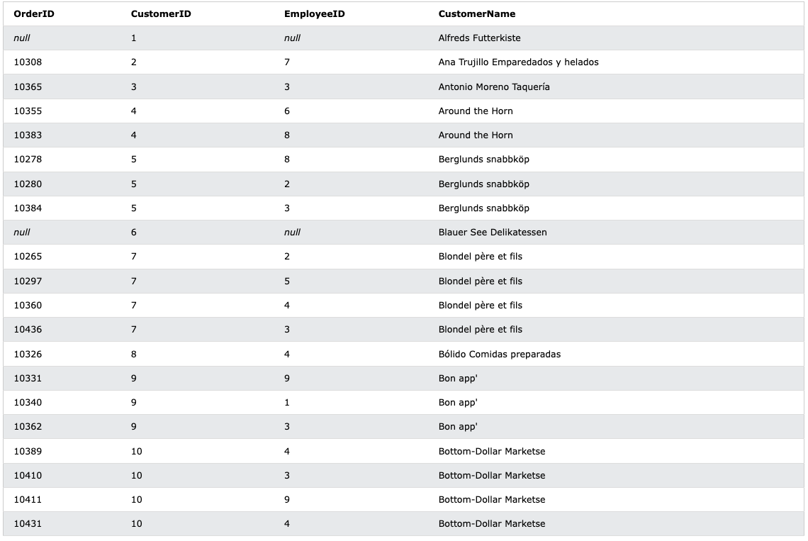 Customers 테이블에 없는 정보는 null로 표시되는 것을 확인할 수 있다.