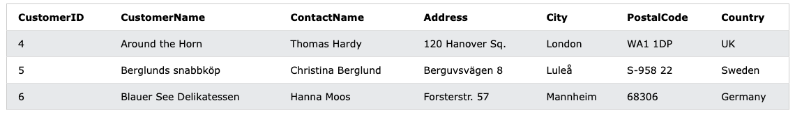 WHERE CustomerID between 4 and 6;