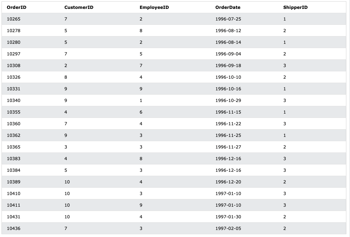 예를 들어, 지금까지 사용하던 Customers 테이블에 더해 아래와 같은 Orders 테이블이 있다고 하자.