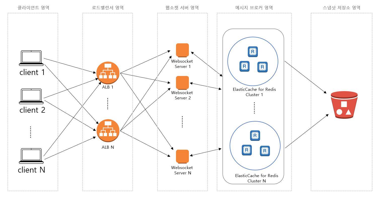 사용자의 요청을 분산시켜주는 로드밸런서와 복수의 웹소켓 서버를 두어 확장성과 안정성을 확보했다.