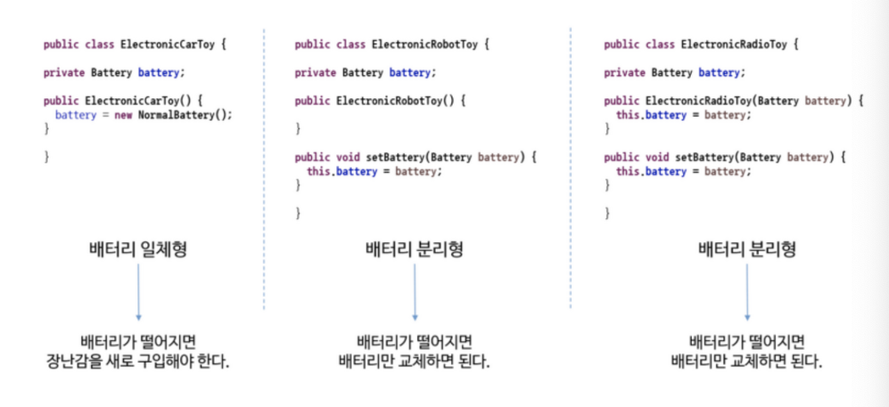 예를 들자면, 배터리 분리형 장난감을 만들어 배터리를 사용하는 장난감에게 배터리를 넣어주는 거라고 볼 수 있다.