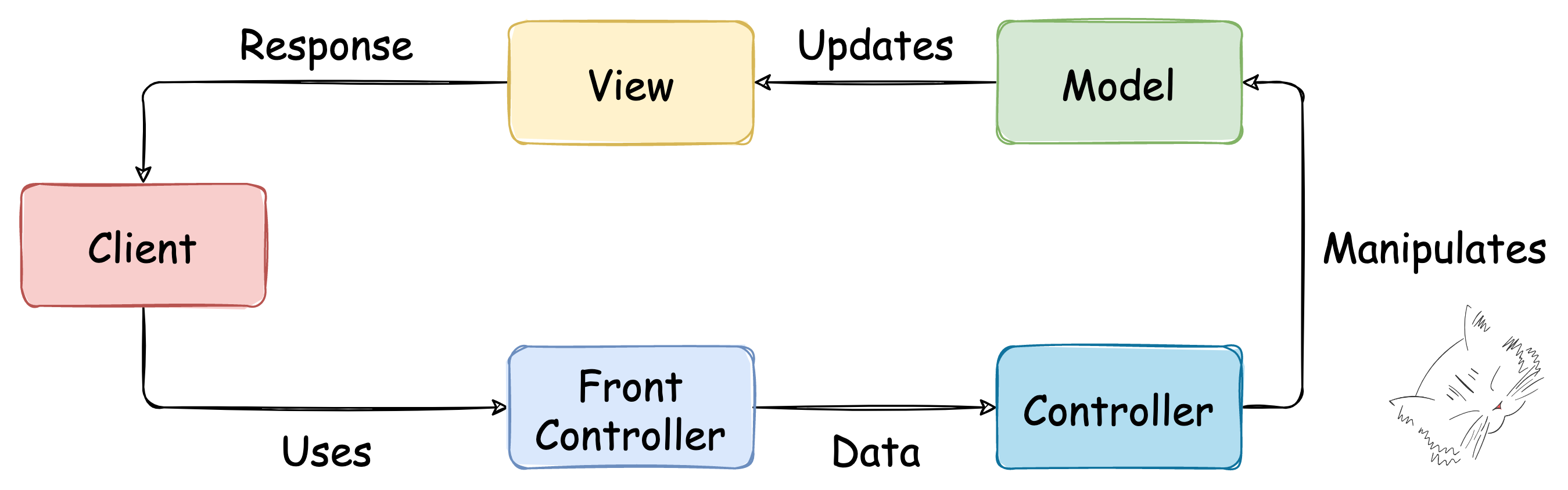 - Client가 요청 데이터 전송 → Front Controller가 요청 데이터 수신 → 비즈니스 로직 처리 → Model 데이터 생성