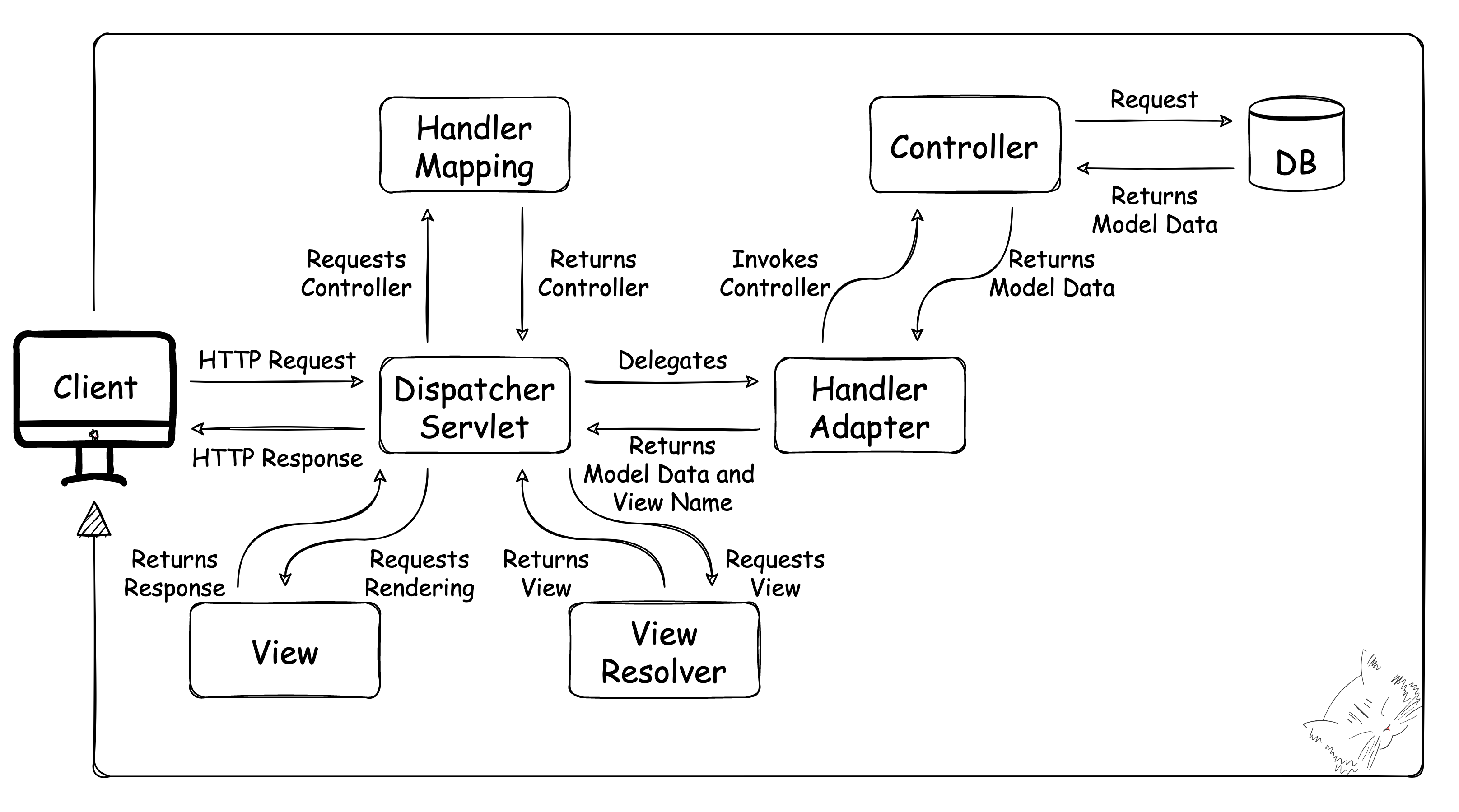 - Handler 메서드가 비즈니스 로직 처리 후 리턴 받은 Model 데이터를 HandlerAdapter에게 전달