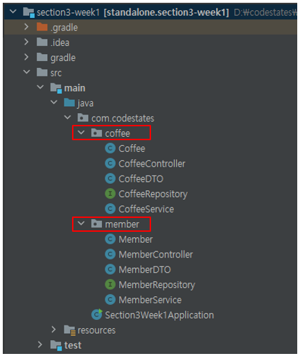 위 그림에선 패키지를 커피 기능과 멤버 기능으로 나눈 것을 확인할 수 있다.