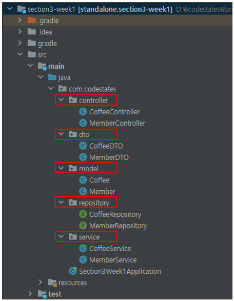 위에서 짧게 언급 했듯이 ‘Controller, DTO’ 클래스는 API 계층에, ‘Coffee, Member, Service’ 는 비즈니스 계층에 해당되며