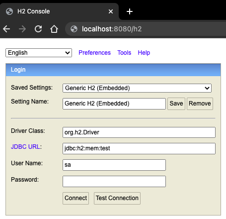 위와 같이 접속한 뒤에 JDBC URL에 위에서 설정한 jdbc:h2:mem:test를 입력하고 Connect를 누른다.