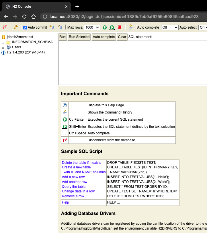 이제 웹 브라우저 상(H2 콘솔)에서 H2 DB에 접속한 후, 데이터베이스를 관리할 수 있게 되었다.
