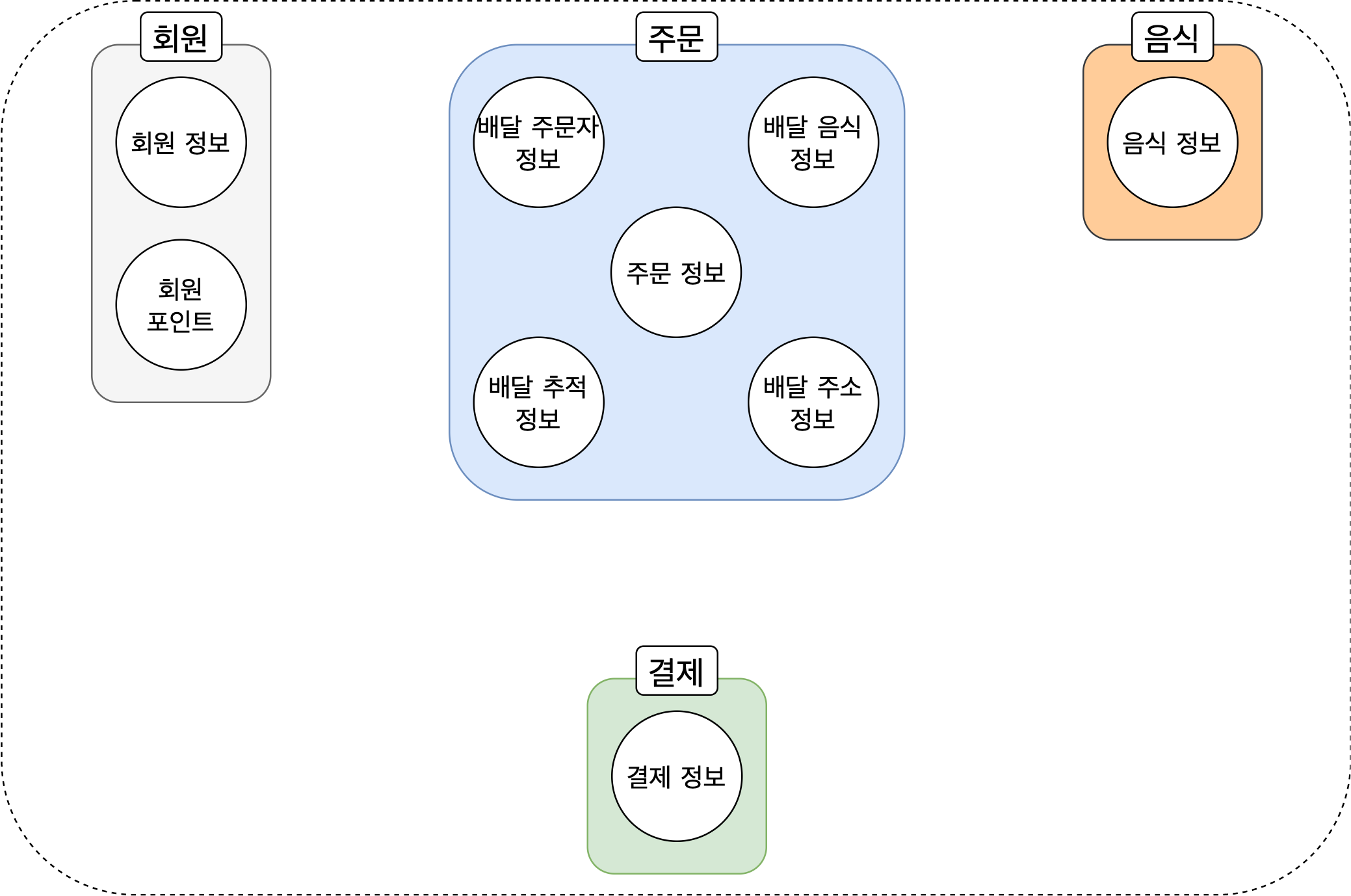 회원, 주문, 음식, 결제라는 상위 도메인 아래에 각 정보를 담은 하위 도메인이 위치한 것을 확인할 수 있다.