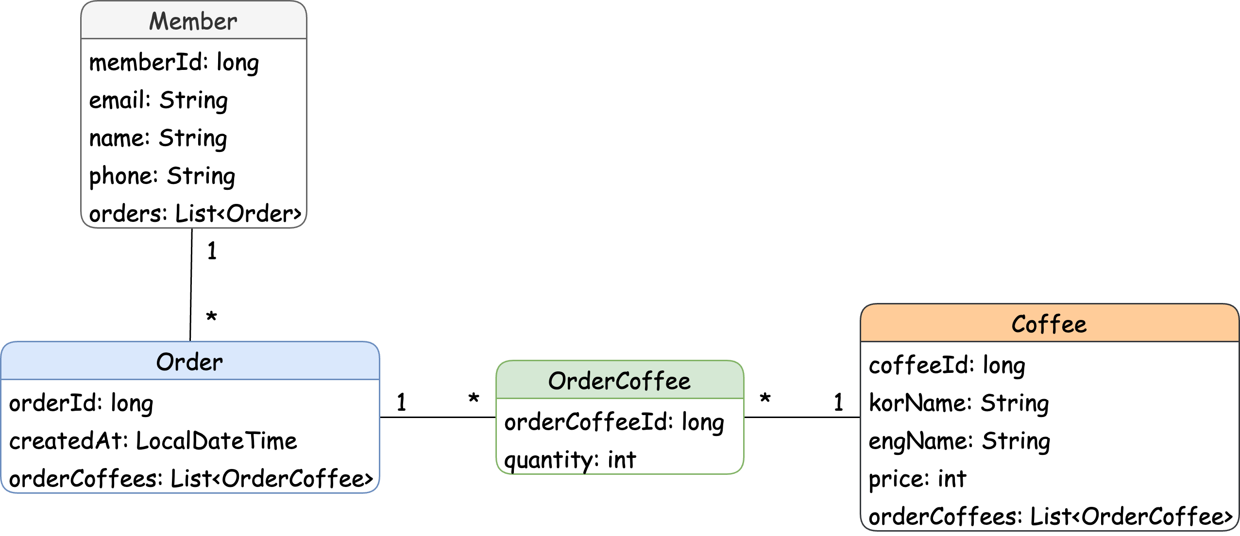 - Order와 Coffee가 N 대 N 관계 → 두 클래스의 관계를 각각 1 대 N의 관계로 만들어주기 위한 OrderCoffee 클래스 추가