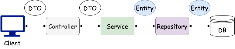 정확하게는 Service 클래스가 Entity를 관리하는 Repository 인터페이스를 이용해 DB에 접근하는 것이다.
