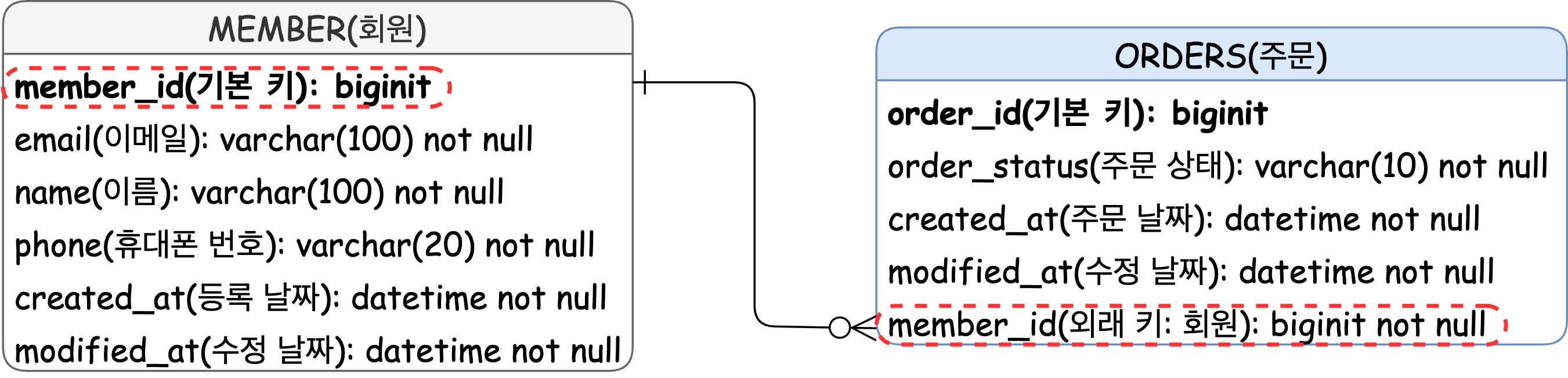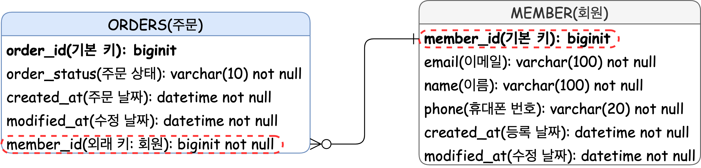 ORDERS 테이블이 MEMBER 테이블의 member_id를 외래 키로 가지며,