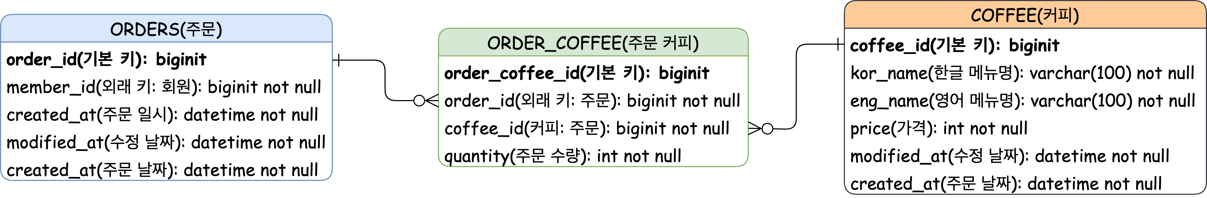 첨부한 글에서도 예를 들었듯이 주문(Order)과 커피(Coffee)의 관계가 대표적인 다대다 관계이다.