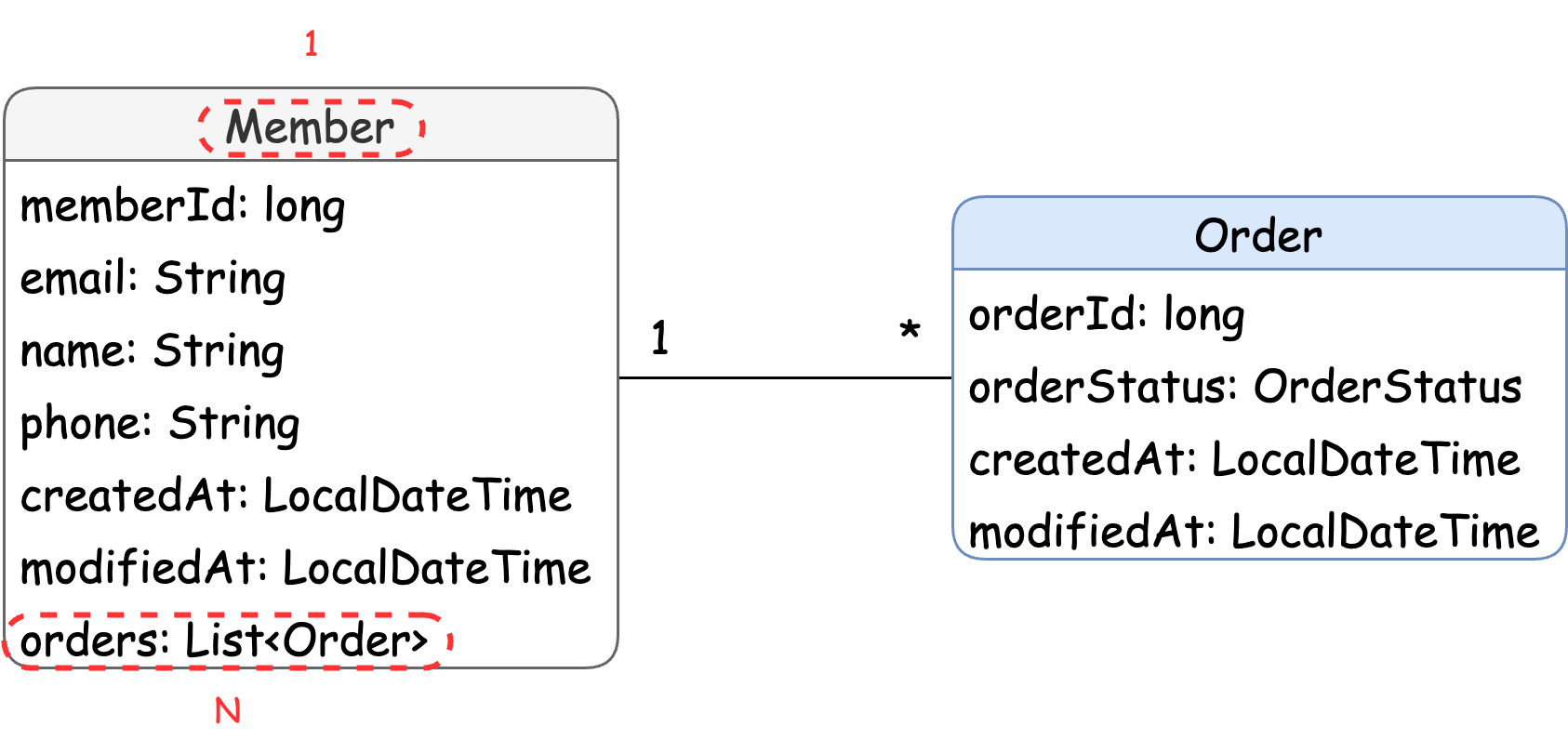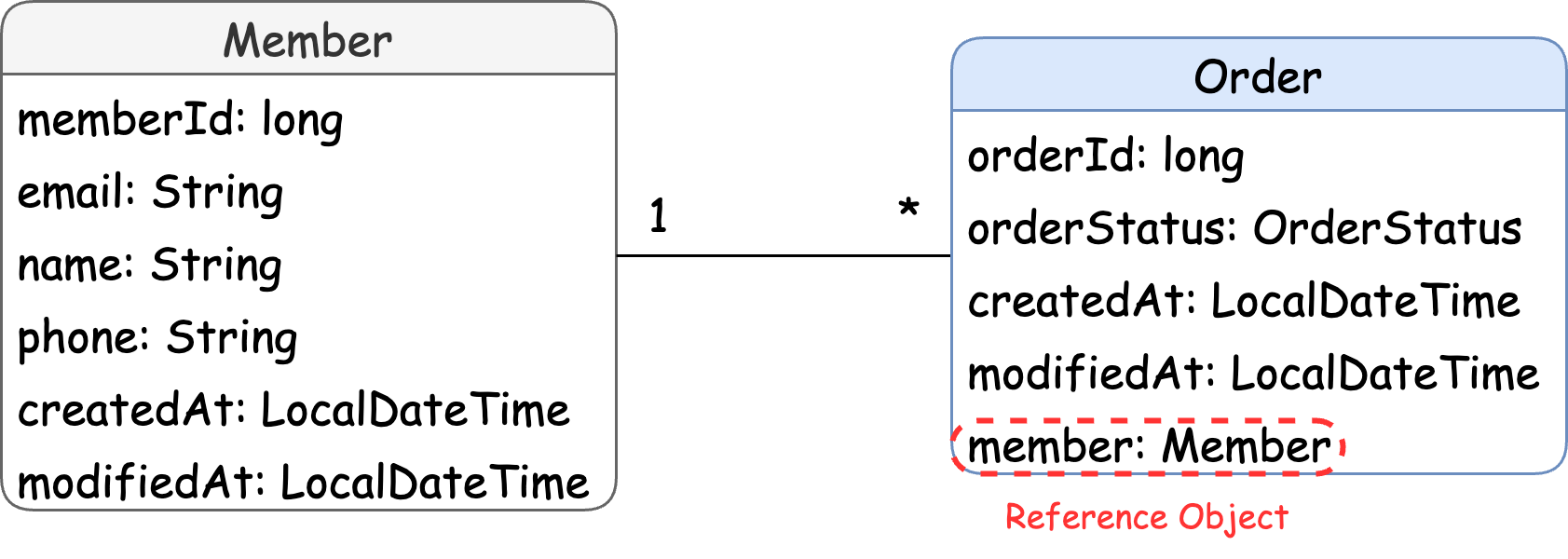 위 그림에서 한 명의 회원이 여러 건의 주문을 할 수 있으므로 Member와 Order는 일대다 관계가 된다.