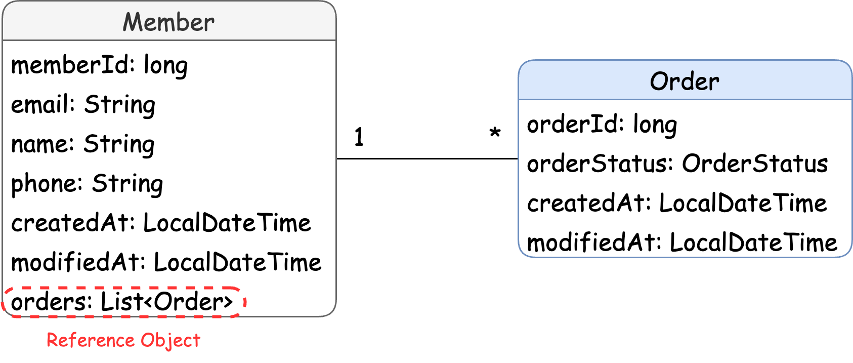 위 그림에선 Member 클래스가 Order 객체를 원소로 가진 List<Order> 객체를 가지고 있으므로 Order를 참조할 수 있다.