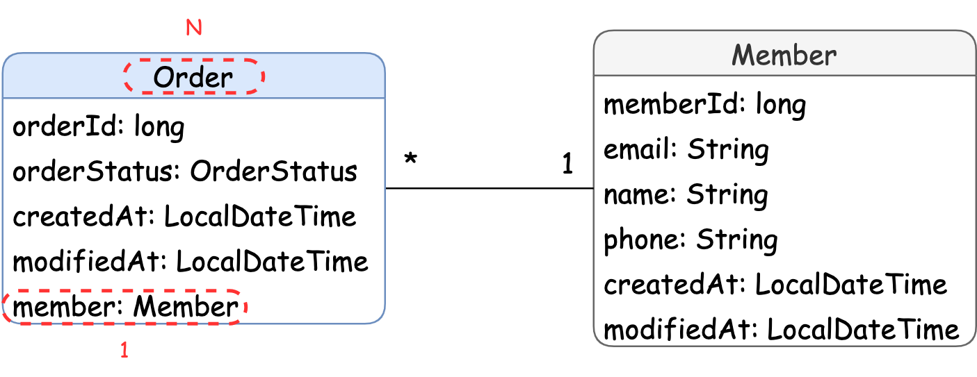 위에서 본 것과 같이 한 명의 회원이 여러 건의 주문을 가질 수 있으므로 Order와 Member는 다대일이며,