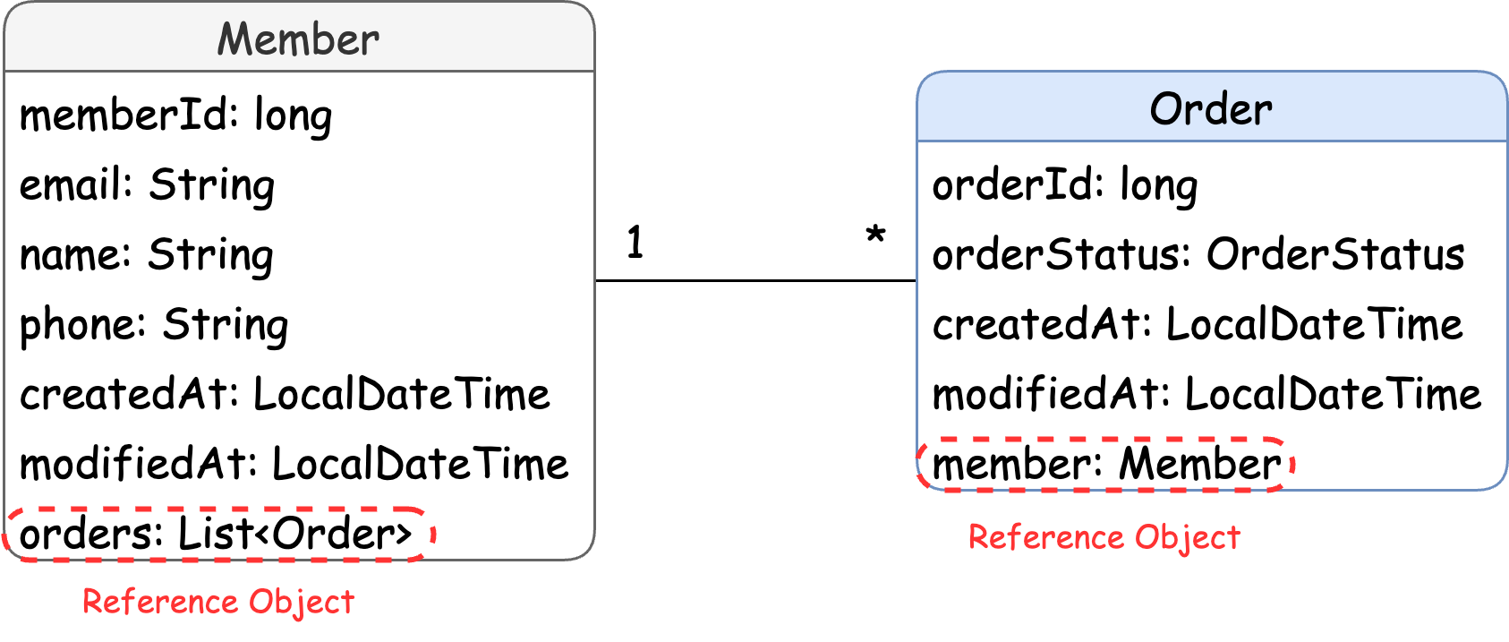 Member와 Order 클래스가 모두 서로의 정보에 접근할 수 있는 참조 객체를 가지고 있다.