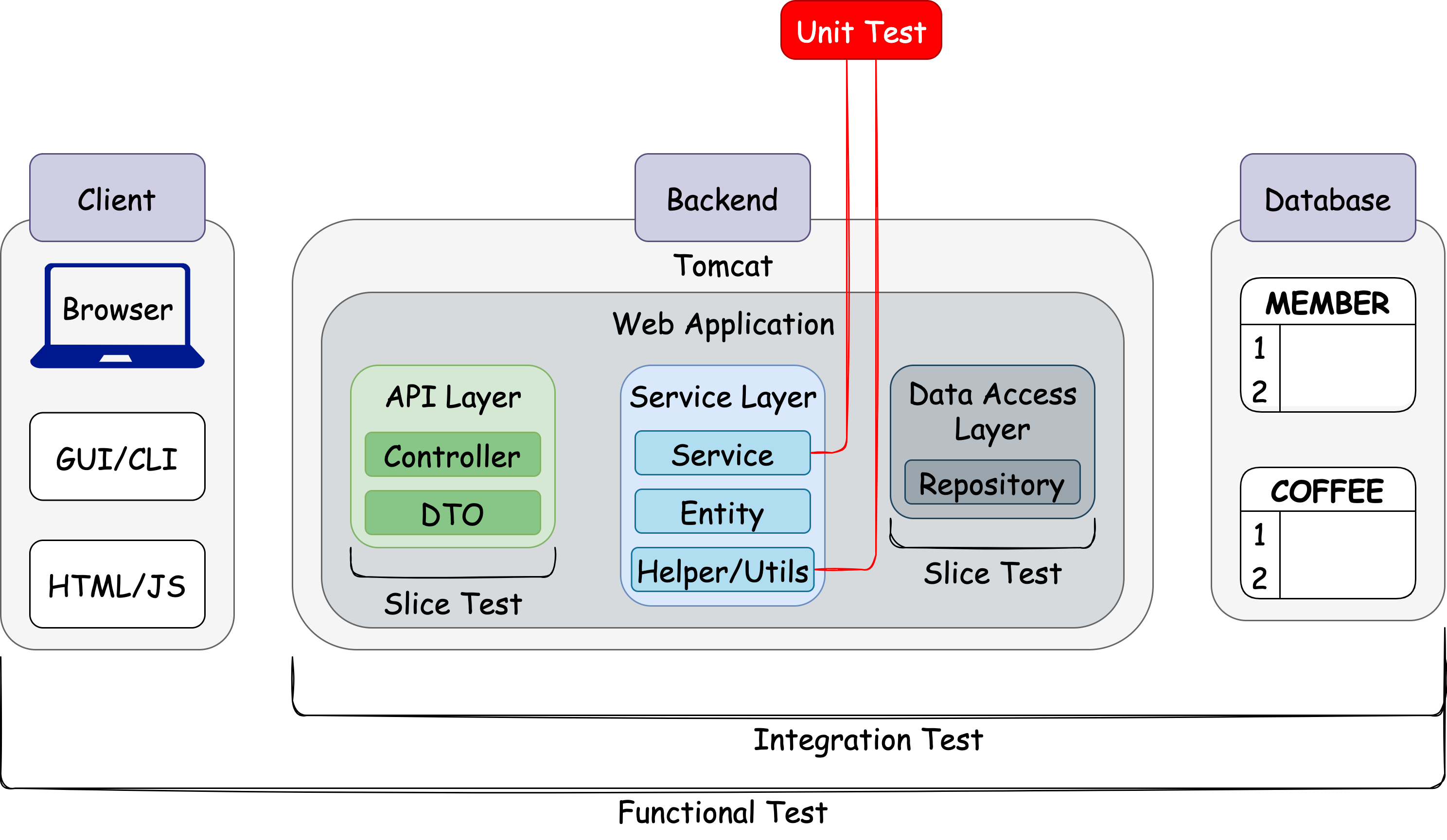 위 그림에선 API, Service, Data Access 계층이 각각 슬라이스 테스트의 대상이 된다.