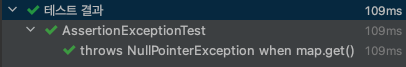 위와 같이 발생이 기대되는 예외 클래스(NullPointerException.class)를 입력한 뒤 테스트 대상 메서드를 호출한다.