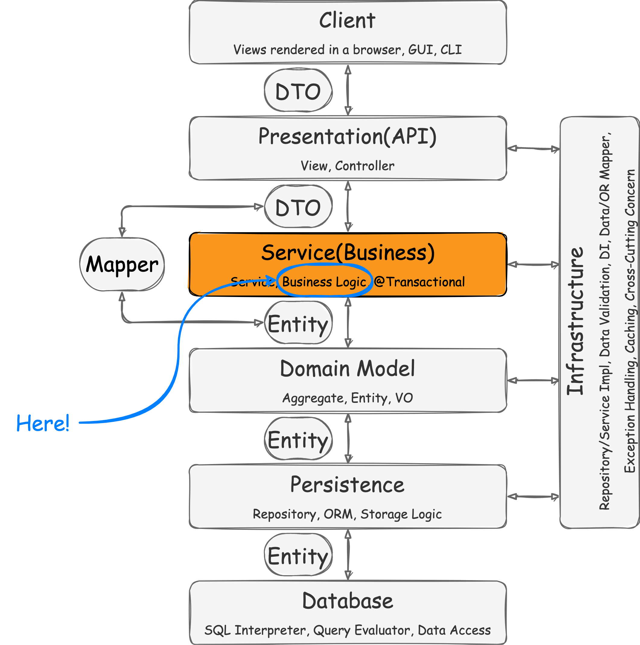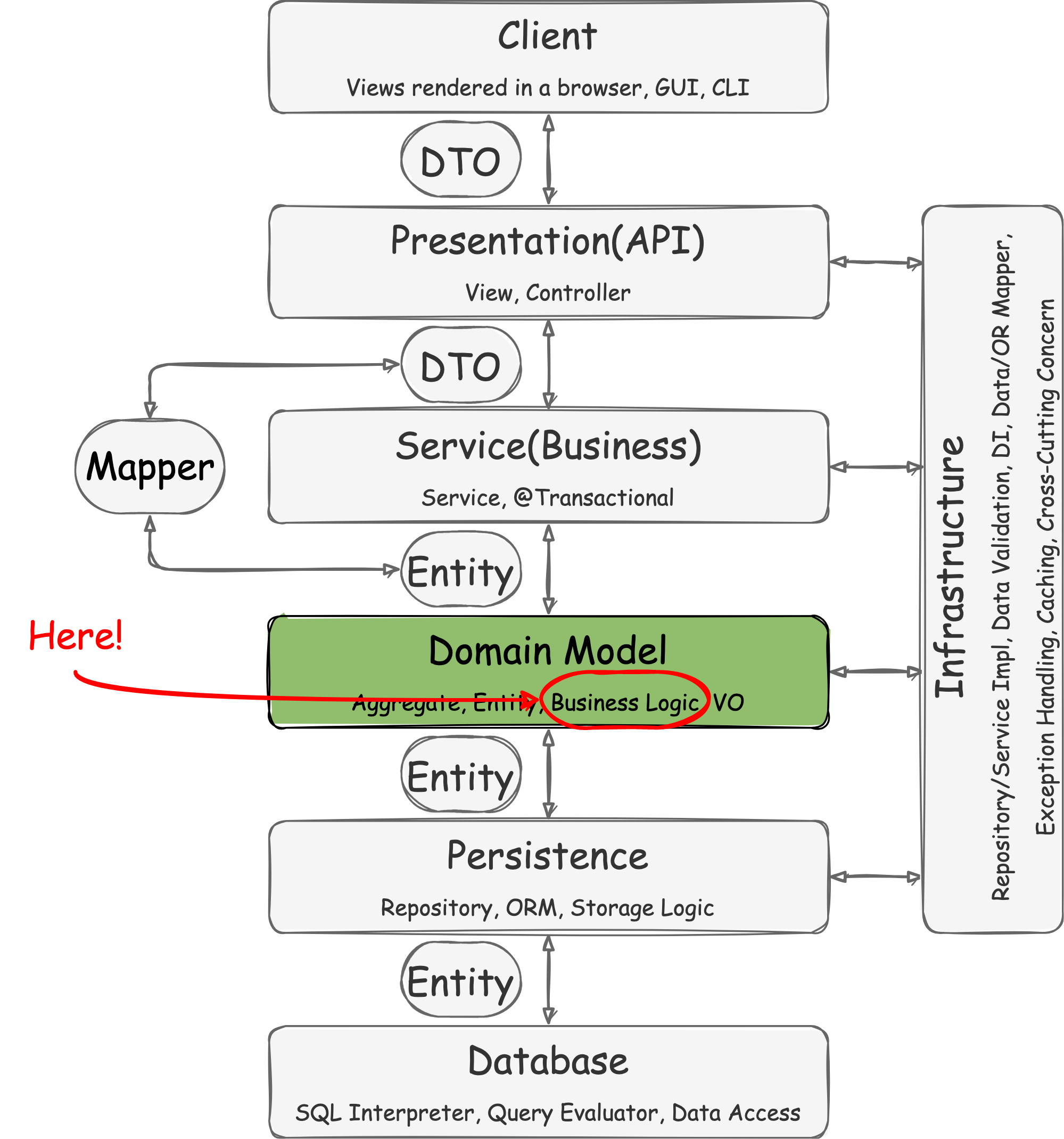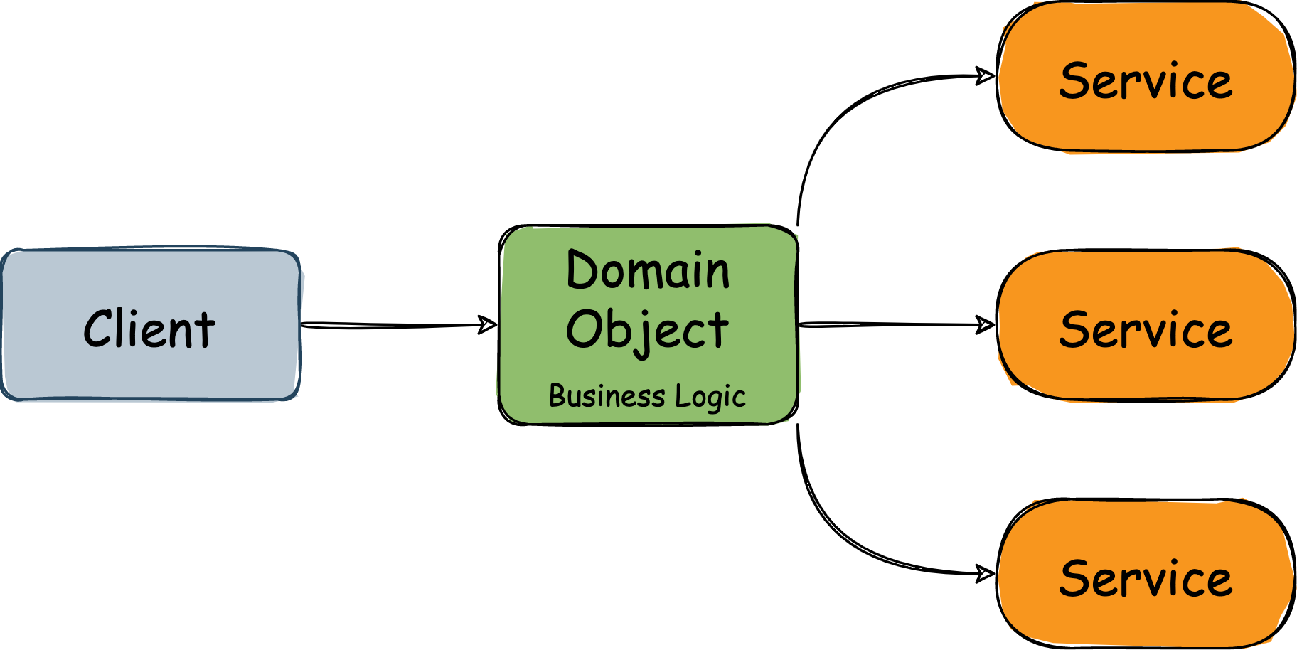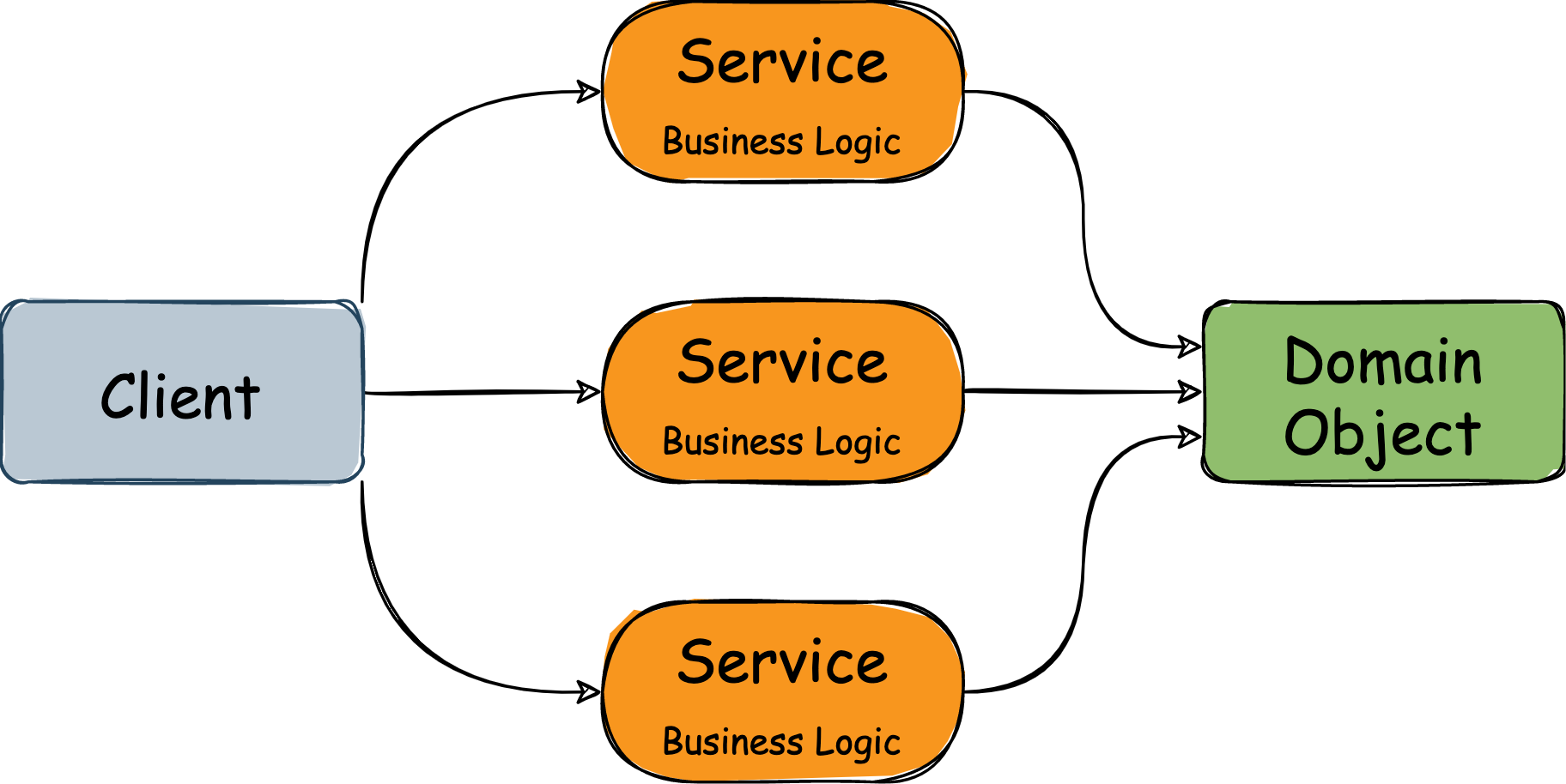 즉 위 그림처럼 서비스 객체가 비즈니스 로직을 가지고 앱의 실행 흐름에 따라 도메인 객체를 이용한다.