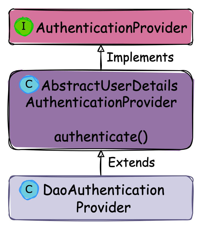 - AuthenticationProvider는 실질적인 인증을 수행하며 인증 처리는 authenticate() 메서드로 시작된다.