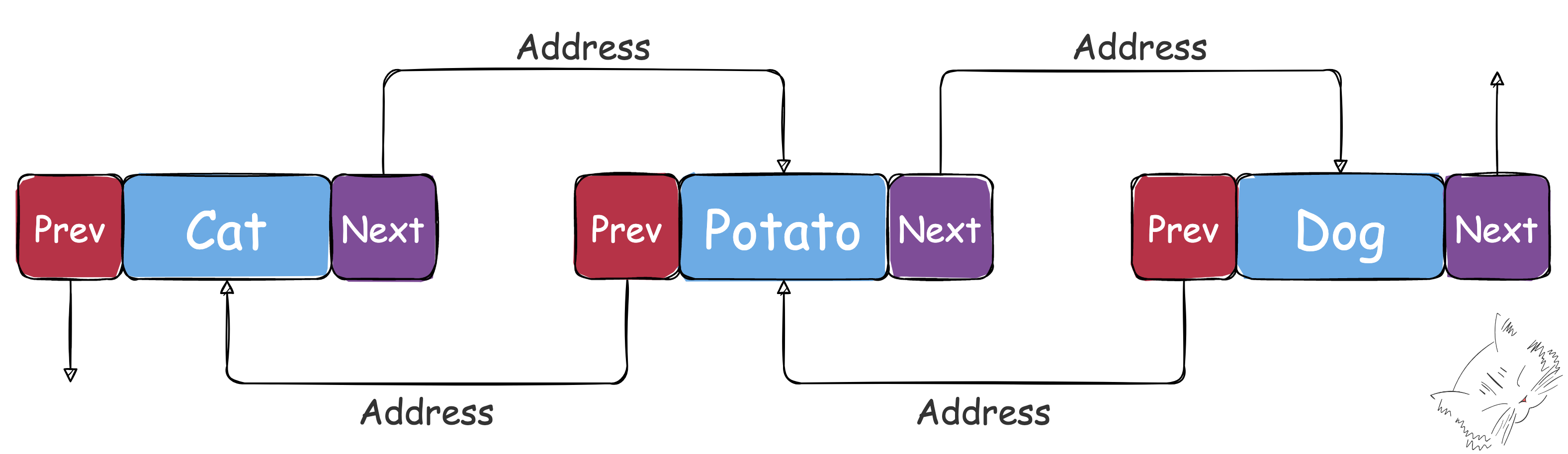 모든 노드는 데이터와 함께 이전/이후 데이터의 주소 값을 가지고 있으며, 삽입/삭제 시 인덱스의 이동이 아닌