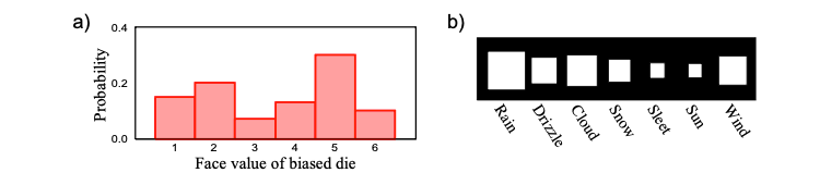 무한할 수도 있다(예: 다음 기차에 탈 사람의 수는 이론적으로 무한 가능). - 이산 확률 변수의 확률 분포는 히스토그램이나 힌튼 다이어그램(Hinton diagram)으로 시각화할 수 있다 (그림 2.1).