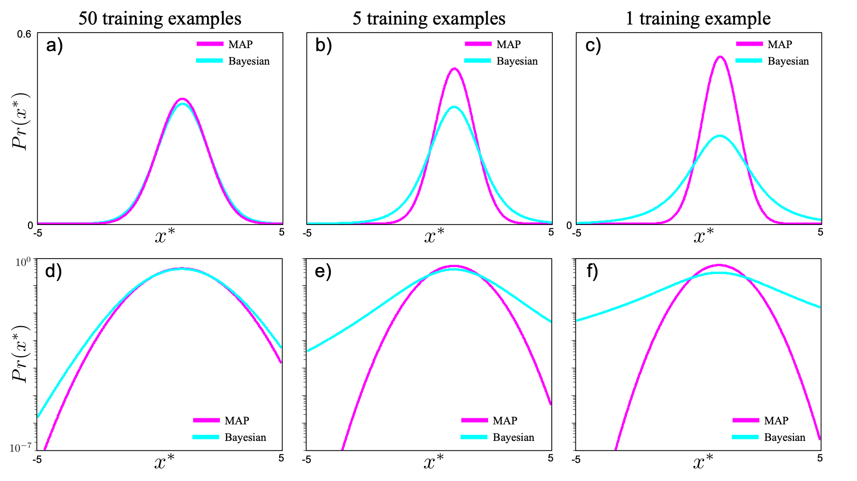 각각의 서브그림은 베이지안 예측이 단일 파라미터 추정에 기반한 MAP 방식과 어떻게 다른지를 보여준다.