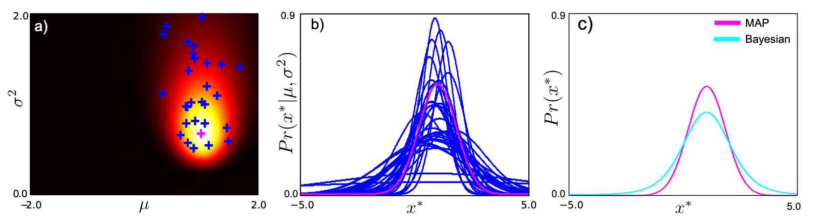 - 베이지안 예측 분포는 위의 모든 가능한 정규 분포들의 가중 평균이다.