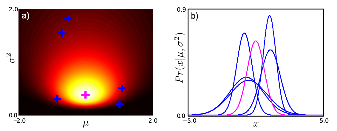 $$Pr(x^*|x_{1...I})=\iint Pr(x^*|μ,σ^2)⋅Pr(μ,σ^2|x_{1...I})dμdσ^2\tag{4.23}$$