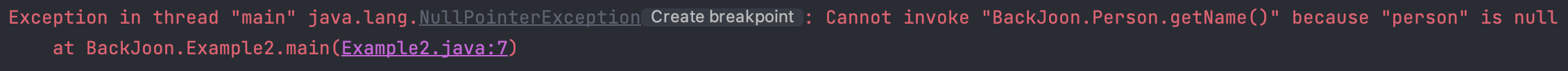 위 코드에서 person 객체를 null로 초기화했기 때문에 person.getName()은 NPE를 발생시킨다.