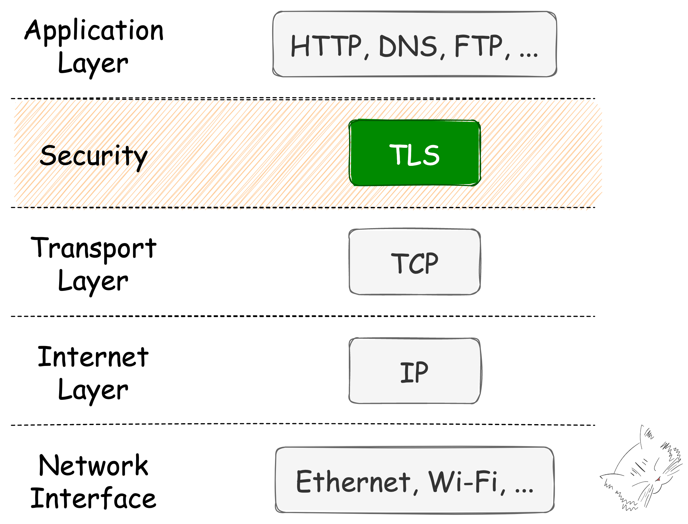 TLS는 그 이름답게 Application Layer와 Transport Layer 사이에서 암호화를 담당하는 프로토콜이다.